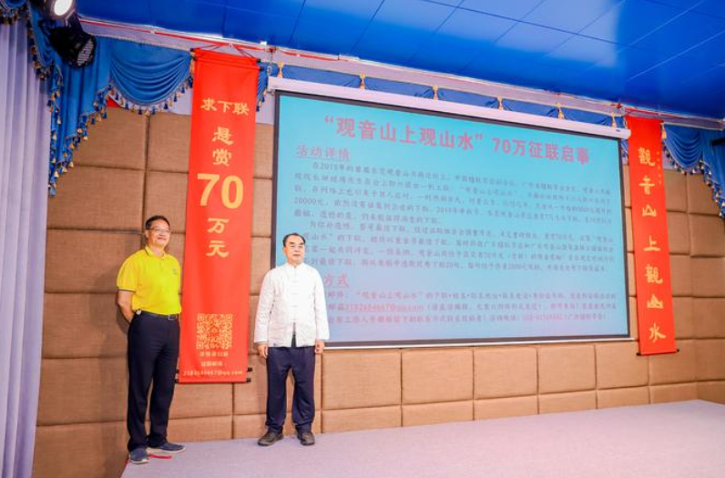 2019年11月7日,“观音山上观山水”妙联品鉴座谈会在素有“文化名山”美誉的东莞樟木头观音山旅游风景区举行,来自北京、天津、安徽、湖北等全国各地的楹联家,雅聚一堂,以联会友,交流互动。座谈会上,观音山景区负责人宣布了一则重磅消息:70万元重金悬赏“观音山上观山水”绝佳下联。1字10万元的征联活动将一直持续到2020年12月31日。消息一经宣布,引爆全场。