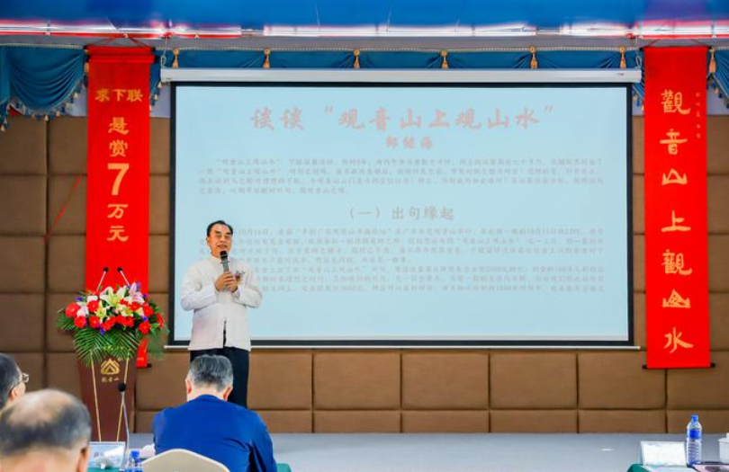 座谈会上,中国楹联学会副会长、广东楹联学会会长、观音山书画院院长邹继海主持了本次座谈会,并对入围的部分优秀下联进行了精彩的品析。其中,邹继海选取了多幅投稿或网络征集的下联,从出句平仄、词性、句子成分、技巧、对仗等方面进行了全面、专业的分析,为现场“联友”提供了创作时候的借鉴和参考。