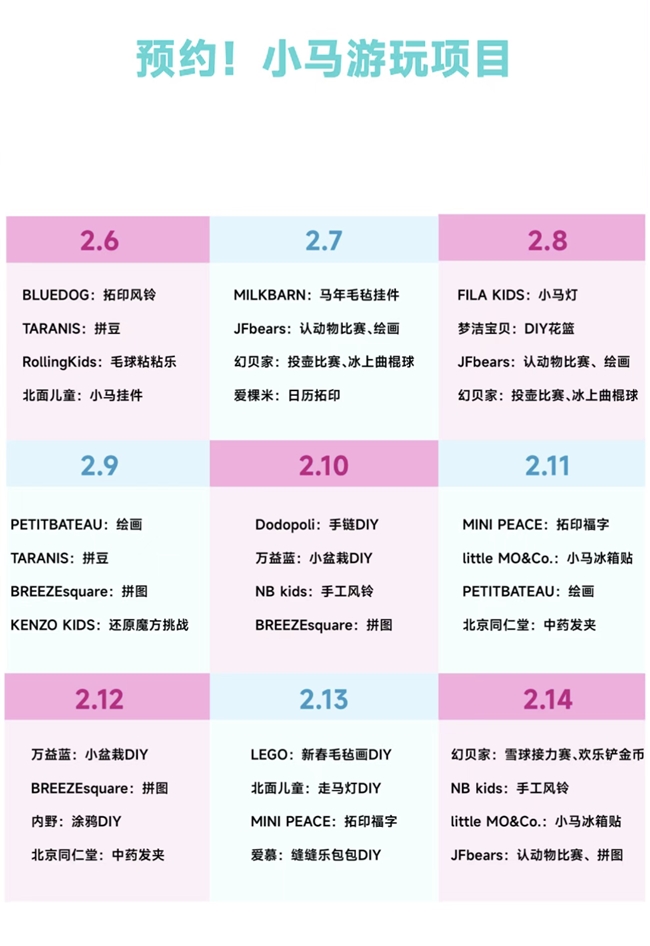 转至B1F,宁波阪急在2月6-14日精心筹备了30+种不重样的手作体验项目。在这里,孩子们领取专属的“小马游玩日程表”,如同拿着护照打卡世界的旅行者。 无论是色彩的调配还是材质的拼贴,每一次手作都是孩子内心世界的投射。家长不再是旁观者,而是共同创作者。完成任一项目后,同样可获得一枚“扭蛋币”贴纸,让这份通过亲子合作获得的快乐具象化。
